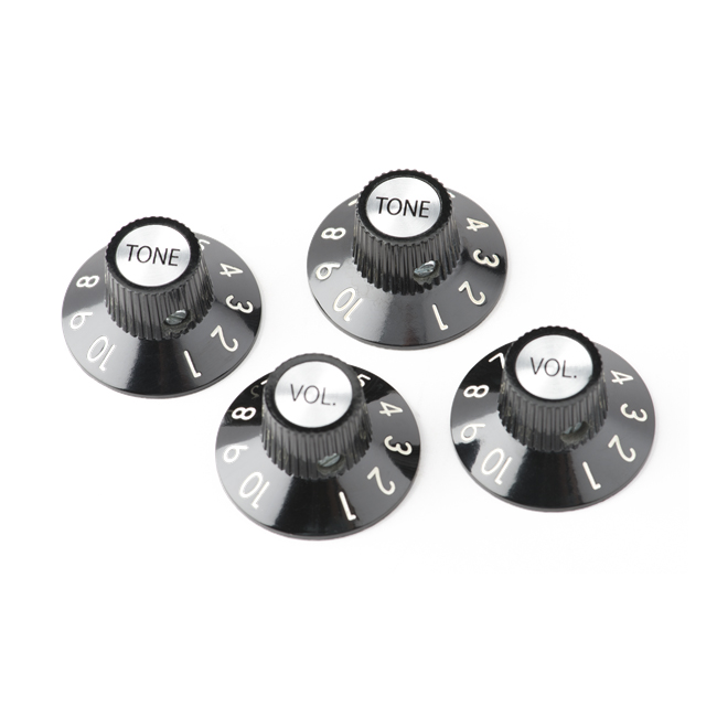 Package of four plastic 1-10 numbered knobs with mounting set screws. Includes two "Volume" and two "Tone" knobs. Designed to fit 1/4" solid shaft potentiometers.