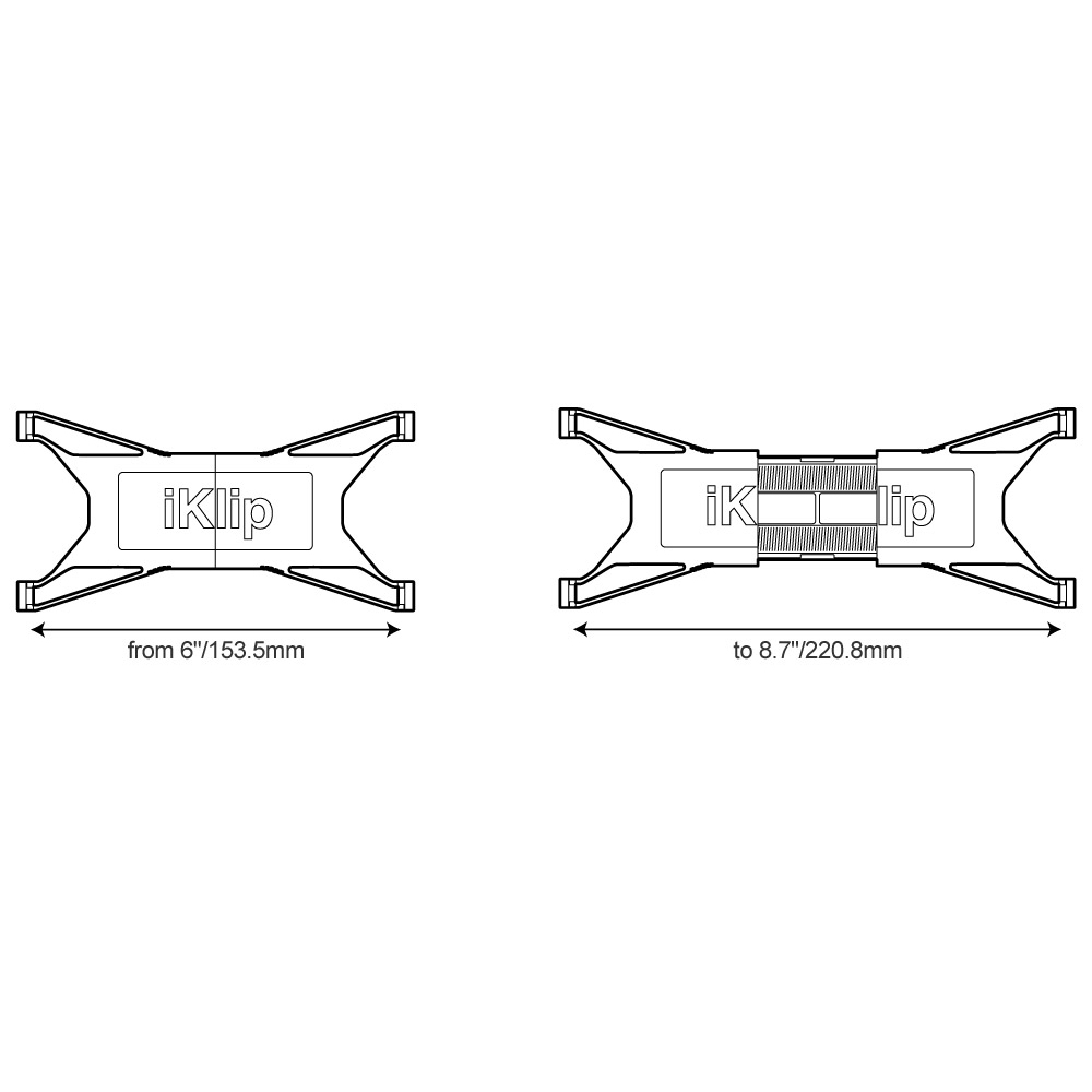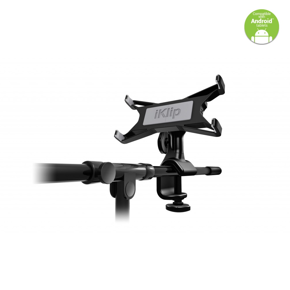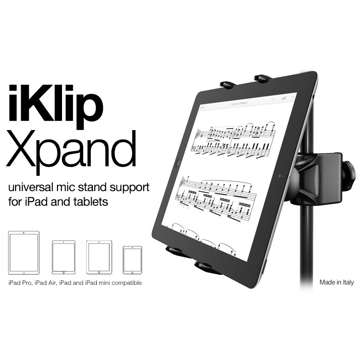 • Universal expandable microphone stand mount for all tablets and iPad models and generations • Expandable arms can hold all popular tablets sized 7” to 12.9” • Smart bracket design leaves buttons and ports free from obstruction • Ball joint global positioning system provides easy adjustable viewing angle and free rotation between portrait and landscape orientations • Adjustable mic stand clamp can be mounted on a vertical pole or horizontal boom with a diameter of up to 1.2” (30mm) • Two sure-grip rubber gripping points and rubber padded base that support the tablet securely without scratching or marring its surface • Comes with iKlip Stage, a powerful page turning and music score management app • Compatible with any iPad, iPad mini, iPad Air, iPad Pro and tablet model with screens ranging in size from 7” to 12.9” with case on. • Designed and made in Italy