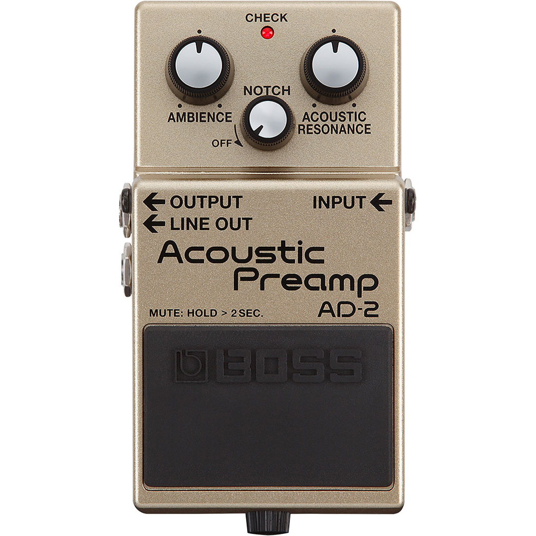 Natural Acoustic Sound Everywhere You Play With the AD-2 Acoustic Preamp, acoustic-electric guitarists can now experience natural, studio-quality sound while performing on any stage. Equipped with an advanced BOSS sound engine, this compact pedal packs sophisticated processing power that belies its small size and simple, intuitive interface. Acoustic Resonance reproduces the complex resonance characteristics of your unplugged tone, while Ambience provides pro-level reverberation perfectly optimized for acoustic guitar. The AD-2 also features essential stage tools such as a notch filter for feedback control, a balanced DI out for direct connection to a PA, and a convenient mute function for tuning and switching guitars.