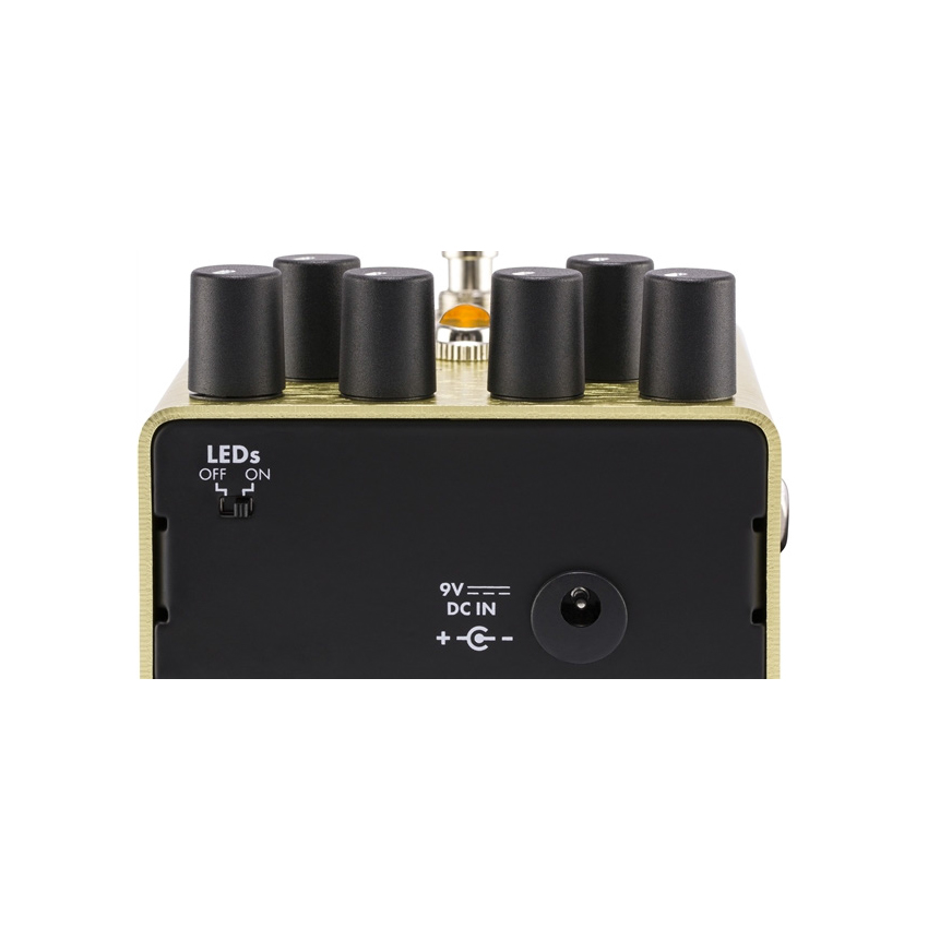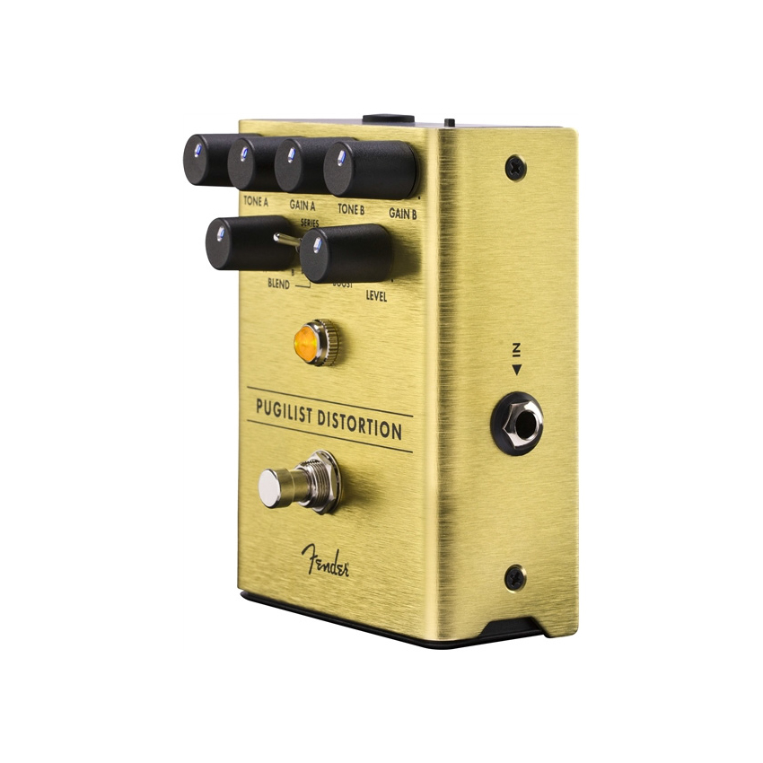 Fiery sounding and flexible, the Pugilist Distortion is ready to add some heavyweight gain to your rig. This original design features dual gain engines—with independent tone controls for each—letting you select multiple variations of distortion, ensuring this pedal will play well with any rig. Series/Blend switch lets you stack channels for thick, cascading distortion, while the Bass Boost switch fattens up your tone. The Blend control mixes the two channels to get the best of both worlds, crafting a sound just for you. Designed by Fender's in-house team of experts, the Level Set Buffer is an all-original circuit. They consulted with a plethora of players while designing this pedal, and the resulting stompbox is packed with stage-ready features. The chassis is crafted from lightweight, durable anodized aluminium, and the Amp Jewel LED gives your pedalboard the classic Fender look. The LED-backlit knobs show your control settings on a dark stage at a glance. Fender even made swapping batteries quicker and easier with it's exclusive “patent applied for”, magnetically latched 9V battery door. Ranging from brutal to subtle, the Pugilist Distortion can satisfy all your distortion needs.