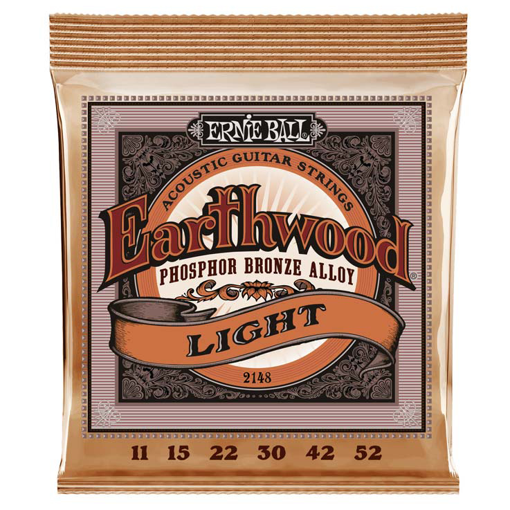 Ernie Ball Earthwood Phosphor Bronze Acoustic Guitar Strings are made from 92% copper, 7.7% tin, 0.3% phosphorus wire wrapped around tin plated hex shaped steel core wire. These guitar strings have a light orange, gold color and provide a mellow, ringing sound, with excellent clarity.