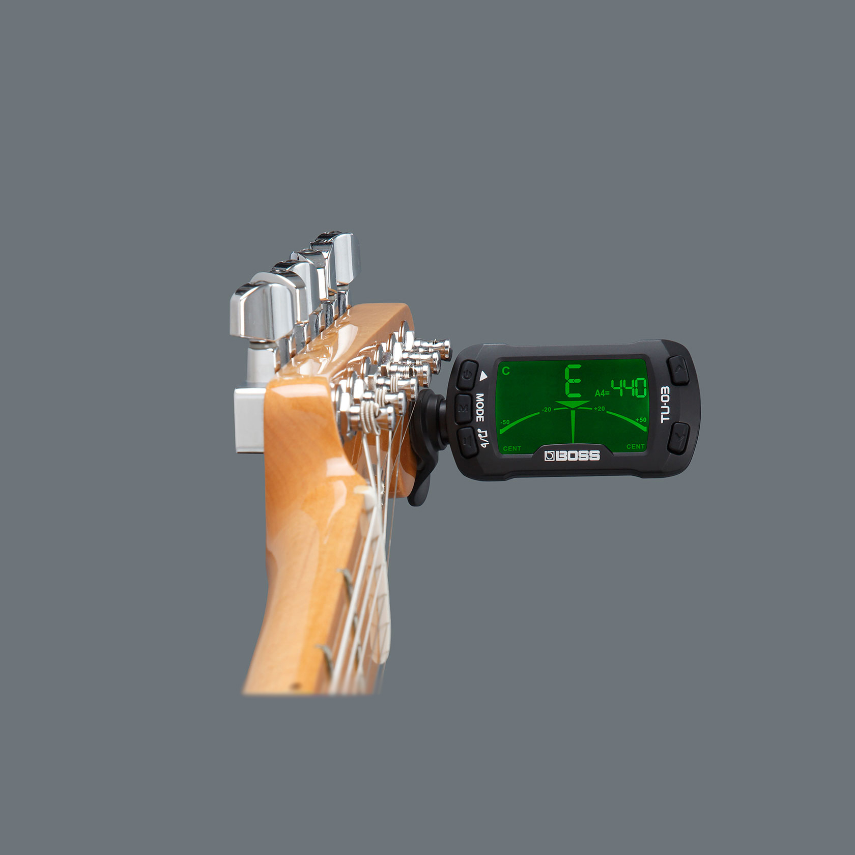 • Clips onto the headstock of a guitar, bass, ukulele, or other stringed instrument