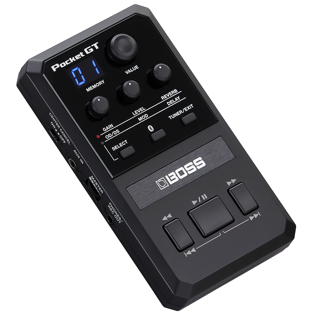 Pocket GT's simple-yet-powerful interface puts an array of essential functions at your fingertips. Scroll through user memories with a dedicated knob, tweak amp gain and effects levels, and activate the built-in tuner with a quick press. Remote control buttons are provided as well, providing fast access to YouTube playback. And with the Center Cancel switch, you can instantly reduce the volume of vocals and guitar solos in songs and play them yourself.
