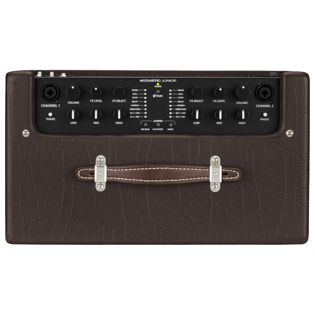 The Acoustic Junior amplifier delivers full, natural, best-in-class performance for acoustic-electric guitar and vocals. This powerful, portable system has two channels designed for instrument or microphone use, each with studio-quality effects. Other convenient features include Bluetooth wireless audio streaming, an onboard 90-second looper perfect for solo shows, and more. Features 90-Second Looper with Record/Dub, Play/Stop, and Undo buttons. Loop, overdub, and undo up to 90 seconds of your playing/singing. Create your own backing loops on-the-spot to amaze and delight yourself and your audience! Bluetooth Pairing for audio streaming from phones and tablets Play backing tracks or “break” music from your phone or tablet, with no need for a cable or separate playback system. Two identical channels, interchangeable for instruments and/or vocals Either channel can accept an instrument or a microphone, and you get 3-band EQ and a choice of eight effects on both channels.