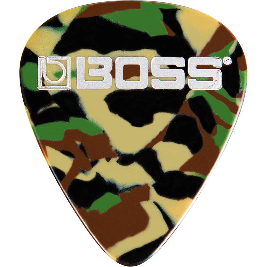 Package of 12 thin guitar picks. American celluloid material and Camo color. BOSS premium picks are manufactured with the highest quality materials for great feel and playability. They?re ideal for all styles, and feature clean, polished edges for easy control and consistent tone.