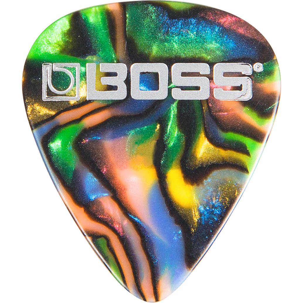 Package of 12 American celluloid material, Abalone color, guitar picks. BOSS premium picks are manufactured with the highest quality materials for great feel and playability. They?re ideal for all styles, and feature clean, polished edges for easy control and consistent tone.