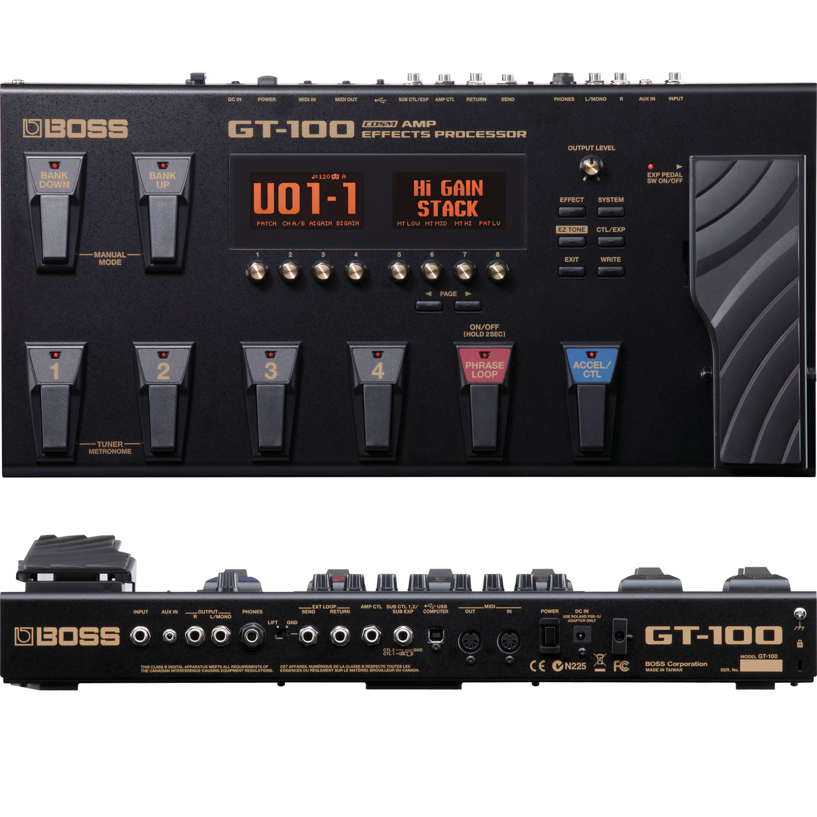 High-end amps and effects from vintage to modern with advanced flexibility With the new GT-100 Version 2.0 update, BOSS? high-end multi-effects processor is now even more powerful than before, adding a host of great new features to its already formidable arsenal. Two new amp types are included, along with cutting-edge MDP effects, an acoustic guitar simulator, and an improved rotary effect. A convenient Guitar-to-MIDI function is on board as well, letting you connect to a computer to play soft synths and input MIDI note using your normal guitar. The GT-100?s USB audio capabilities have been expanded too, providing greater flexibility for re-amping applications. And with the BOSS TONE STUDIO software, you can now edit GT-100 patches from a friendly graphical interface on your computer.