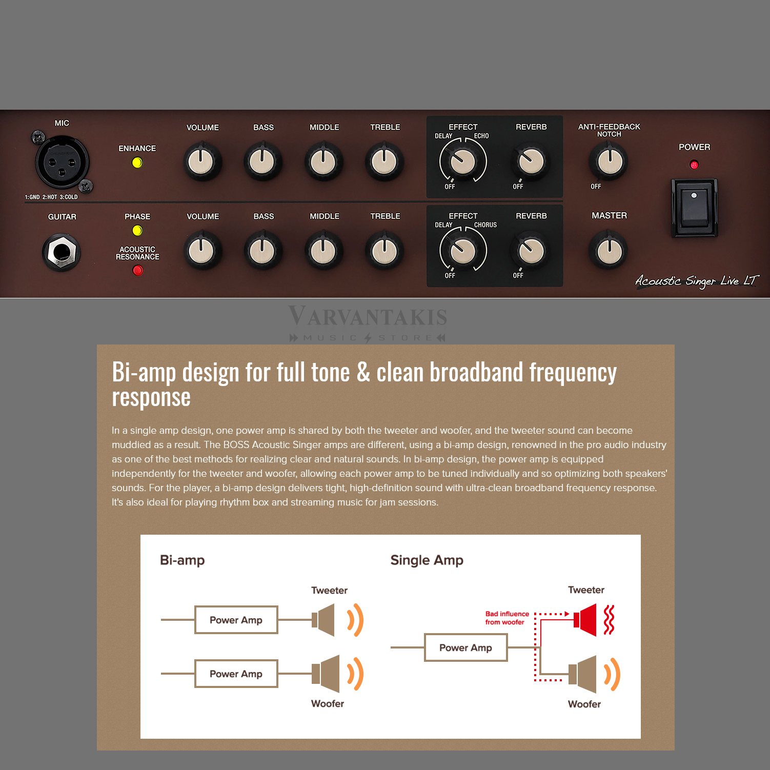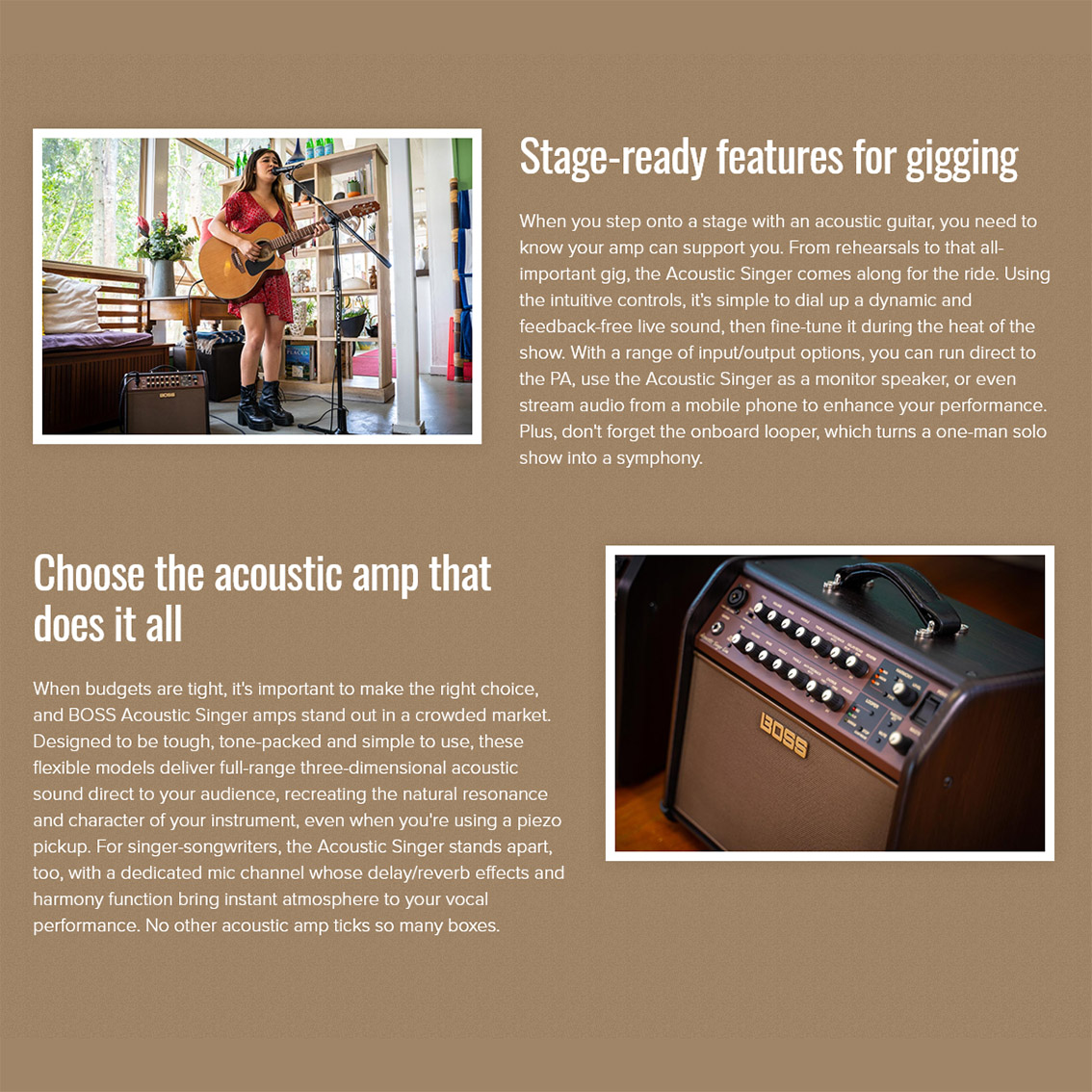 • Acoustic Singer Live—60-watt bi-amp design with intelligent vocal harmony, looper, and dual DI/Line outputs