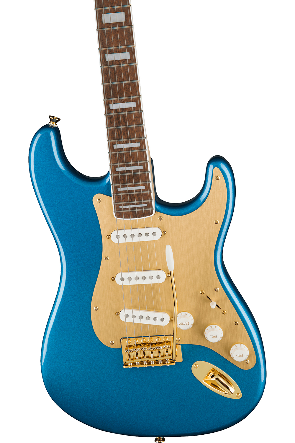 The first instruments to bear the Squier name were introduced in 1982, answering the call for genuine Fender designs at accessible prices. The Squier 40th Anniversary collection celebrates the 40-year journey of Fender?s entry-level brand with this special edition Stratocaster. The Squier 40th Anniversary Stratocaster, Gold Edition is a stylish model adorned with an eye-catching collection of upscale features for the discerning Squier fanatic. Featuring striking gold-plated hardware, a gold anodized aluminum pickguard, a bound Indian laurel fingerboard with pearloid block inlays, an engraved anniversary neck plate and gloss finish throughout, this Strat is poised and ready for the spotlight. Player-friendly refinements of this commemorative model include a slim and comfortable ''C''-shaped neck profile for an easy playing feel, vintage-style tuning machines and 6-saddle synchronized tremolo bridge for authentic performance and style, and Fender-Designed single-coil pickups with alnico 5 magnets for familiar Strat tone.