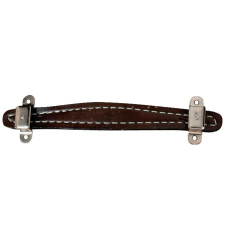 Vintage-style brown stitched leather handle with nickel-plated two-screw mounting caps. Includes mounting hardware.
