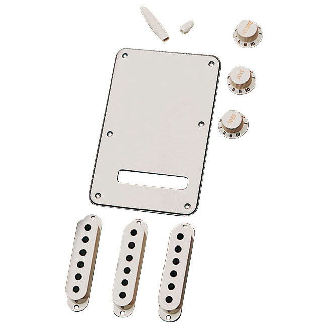 Contains volume and tone knobs, tremolo arm tip, switch tip, tremolo backplate and pickup covers.