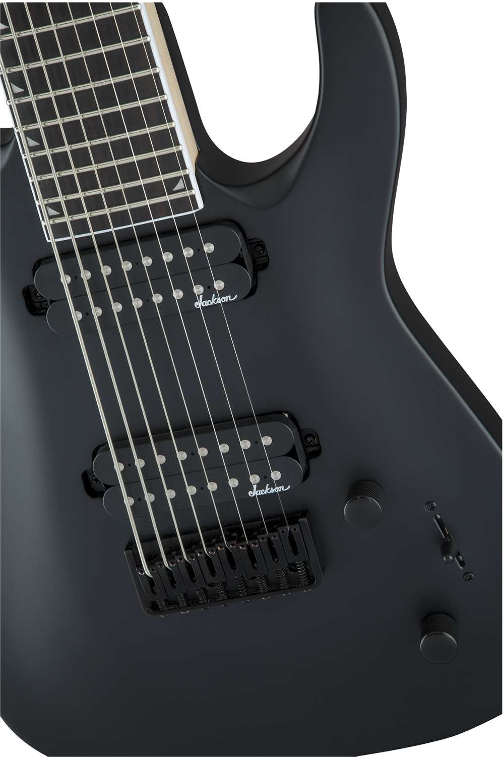 Infused with more than 30 years of Jackson DNA, experience and expertise, the JS Series Dinky Arch Top JS32-8 DKA HT offers an extended range and increased sonic palette for the master composer at a price you can afford. This slick axe features a 26.5'' scale length for better low-end articulation, a lightweight and resonant poplar body with an arched top and a bolt-on maple neck with graphite reinforcement and scarf joint for rock-solid stability. Hosting 24 jumbo frets and piranha tooth inlays, the 12''-16'' compound radius amaranth fingerboard creates the ideal playing surface for fat riffs and easy chording near the black plastic nut while gradually flattening in the upper registers for lightning-quick solos and wide bends without fear of fretting out. Powered by direct mount dual Jackson high-output humbucking pickups, the JS32-8 DKA HT is also equipped with single volume and tone controls and three-way blade switching, string-through-body fixed Jackson HT8 bridge, Jackson 4x4 (4 over, 4 under) AT-1 headstock and sealed die-cast tuners. Offering more for less, this beastly 8-string axe comes in Satin Black with all-black hardware and stylish white neck binding.