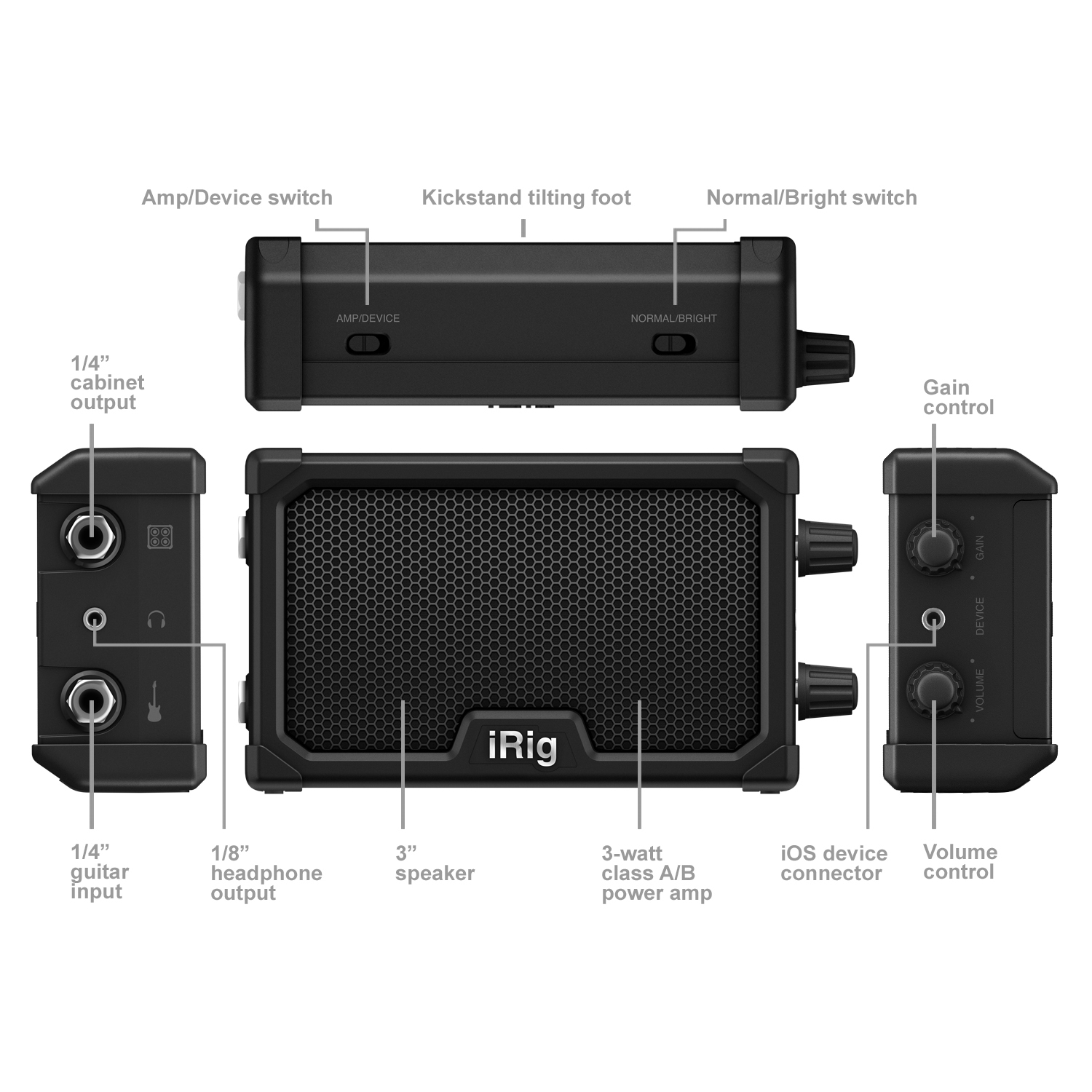 The versatile micro amp with built-in iOS interface What if you could carry in the palm of your hand a guitar amp that had access to virtually any guitar sound you can imagine? And what if you could drive a 4x12" cab with it with no additional gear needed? Now you can with the new iRig Nano Amp - the first micro guitar amp and interface for the mobile guitarist. iRig Nano Amp is a super-compact battery-powered self contained micro amp and interface for iOS that you can use by itself, with headphones or even an external speaker cabinet. What makes it more versatile than any other micro amp is that it features the iRig circuitry so you can plug your iPhone or iPad into it with the included TRRS cable and tap into the limitless world of AmpliTube guitar tone and more on your iPhone and iPad. You can operate it in two different modes: AMP & DEVICE. In AMP mode it's a standalone amp for impromptu practice anywhere. In DEVICE mode you use it as an interface and amp for your iOS device. Plus, in both modes you can use the built-in speaker or hook up an external speaker cabinet - up to a 4x12" cab - for more volume and tonal clarity. iRig Nano Amp features a 1/4" speaker out jack that - get this - can drive up to a 4x12" cabinet. When you plug in, you'll be floored by the volume and tonal definition that iRig Nano Amp provides. You can connect an external cab in both AMP and DEVICE modes giving you the most flexibility of any "micro" amp out there. Tap into the limitless guitar tone with AmpliTube iRig Nano Amp features the famous iRig analog interface circuit for iOS. This means you can use iRig Nano Amp to connect your guitar to your iOS device with the included TRRS cable and tap into the tones of AmpliTube iOS - the leading guitar tone studio app featuring gear from the world's top manufacturers like Fender?, Orange?, MESA/Boogie? and more! AmpliTube and iRig Nano Amp gives players a complete mobile tone and recording solution.